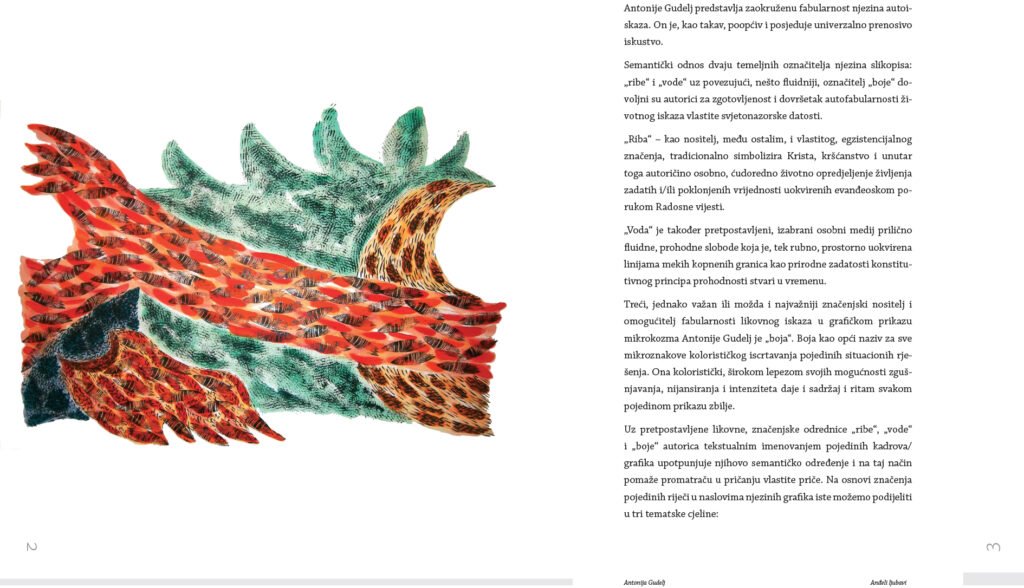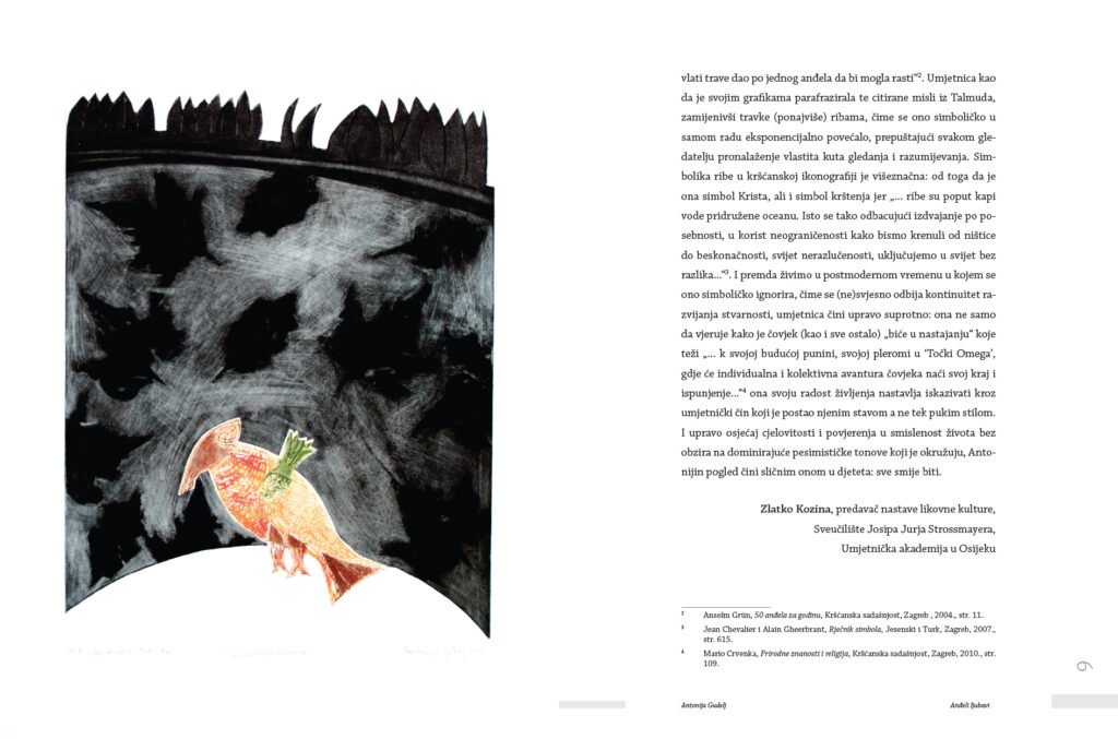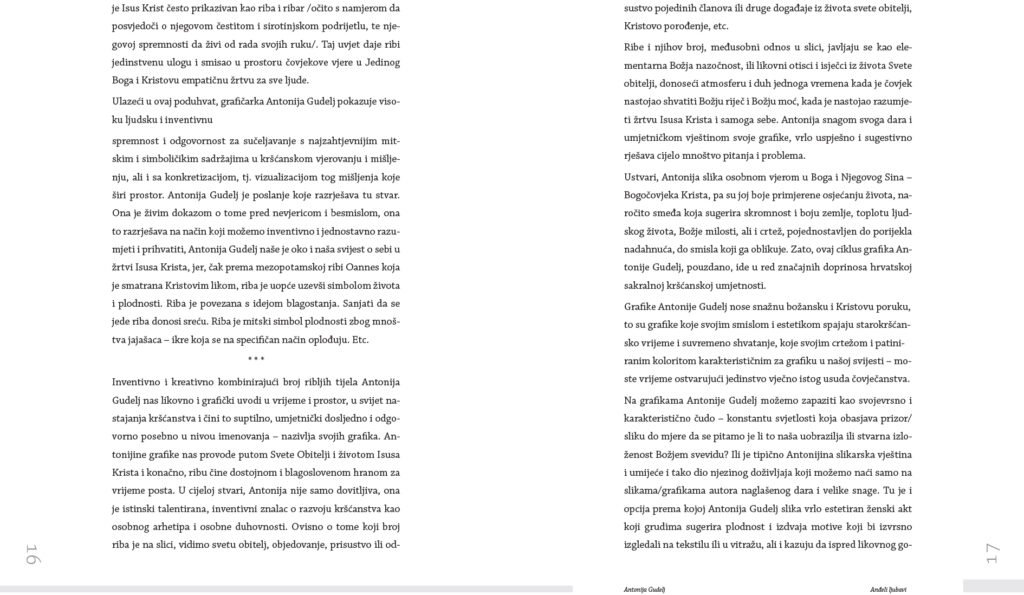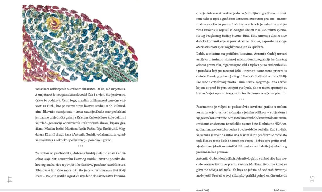 In the stylistic-cognitive design of the graphic work, it faithfully expresses the idea that all poetry is religious. If poetry is not religious, it is not poetry. All poetry, whether research or creative graphic work, directly or indirectly seeks God. Obviously, graphics are the oldest artistic language of spirituality. Etymological expression through the symbol FISH has been close to human nature since ancient times. Deeply rooted in all nations, cultures and religions, the symbol as a means of spiritual expression also takes on the role of an interpreter of the Bible and the divine person of Jesus Christ in Christianity. Such an attitude towards art leads to the view that art is above all a way of expression, or a technical problem. Unlike European theorists of fine arts, who saw art as something understandable, i.e. a means for man to achieve something transcendent, it is believed that the essence of art is not in intelligence, but in an activity, in a technique, a graphic matter that has magic, poetry and life. The works were mainly made using the letterpress technique, mostly with a graphic combination of woodcut and linocut, as a model for medieval technique and its poetic-psychological interpretative expression, which enables further research in the field of graphics.