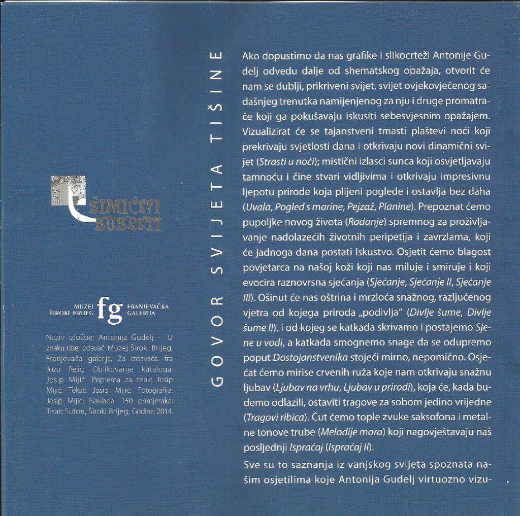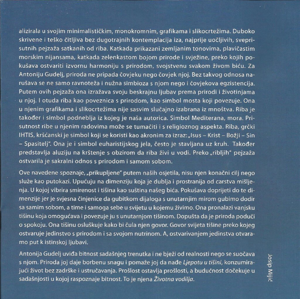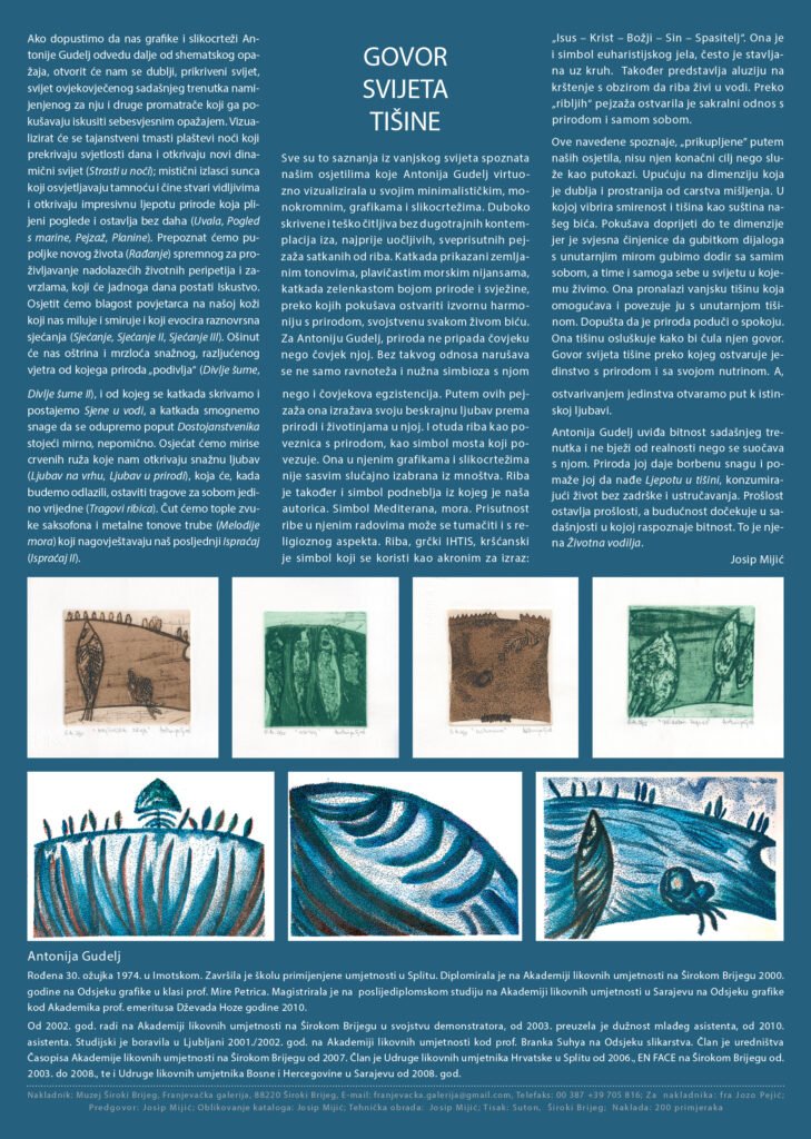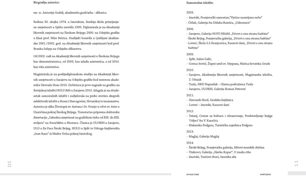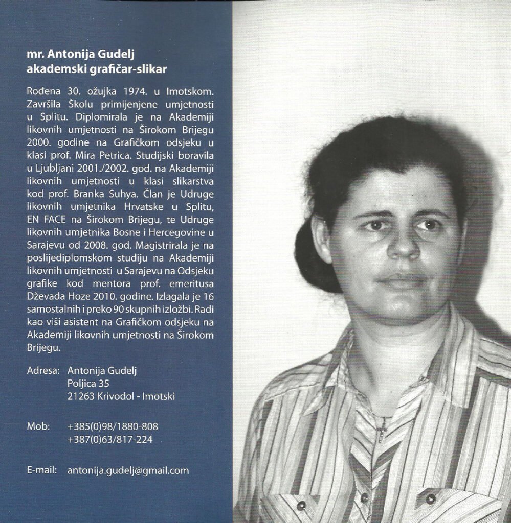 dr. art. Antonija Gudelj was born on March 30, 1974 in Imotski. She graduated from the High School of Applied Fine Arts and Design in 1993 in Split. She graduated from the Academy of Fine Arts of the University of Mostar, based in Široki Brijeg, in 2000, in the graphics department, in the class of Prof. Mira Petric. She completed her postgraduate studies in 2010 at the Academy of Fine Arts in Sarajevo, under the mentor of Prof. Emeritus Dževad Hozo. She has exhibited at 28 solo and about 160 group exhibitions. She is the author of paintings in the church of St. Anthony of Padua in Knešpolje near Široki Brijeg and in the church of St. Anne in Poljica Imotski. She is a member of ULU En Face Široki Brijeg, HULU Split and ULUBiH Sarajevo. She has won two awards for graphics: the first prize for graphics of the ULUBiH at the review exhibition at the Collegium Artisticum in Sarajevo in 2010 and the Gabrijel Jurkić Award at the 2nd International Triennial of Graphics in Livno in 2020. At the Academy of Fine Arts, University of Mostar, in the academic year 2017/2018, she began working on her doctoral dissertation in the field of art, field of fine arts, branch of graphics, with the topic Late Medieval Aesthetics of Christian Symbols in Graphic Art under the mentorship of Prof. Amela Hadžimejlić-Kečo. She received her doctorate on July 11, 2025, at the Academy of Fine Arts in Široki Brijeg, University of Mostar, Bosnia and Herzegovina.