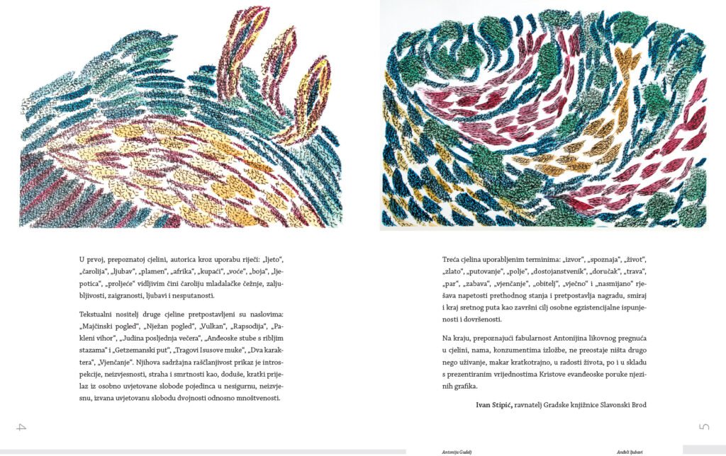 This graphic folder “Canticum canticorum” – “Song of Songs” was printed in 20 copies of which with Arabic numerals of 1/20 marked E.A. Graphic sheets printed in color linocut technique – multicolored on 240 g/m ROSASPINA FABRIANO paper, each copy of the folder contains 33 graphics, format 10x10cm and paper format 18x20cm, introduction, foreword by Antonija Gudelj, list of works and biography of the author.